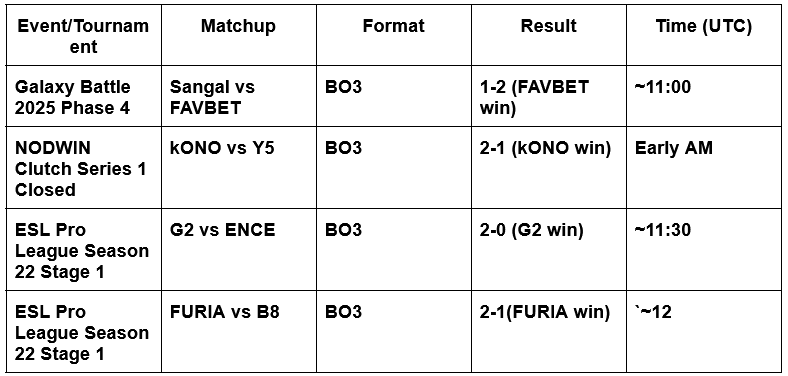 - MANA eSports vs ENCE Academy (BO3) - ~08:00 UTC (ongoing or recently started; part of regional qualifiers).