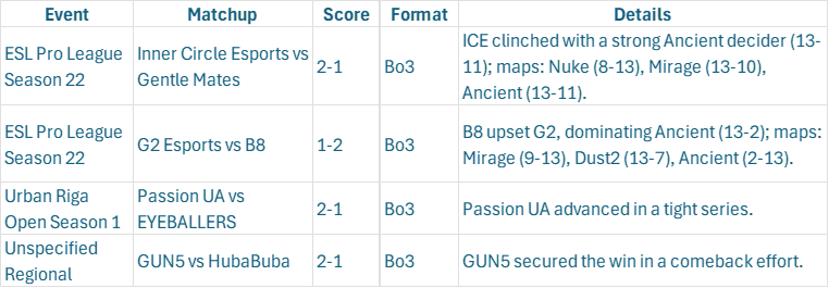 These outcomes reflect the competitive depth, with underdogs like B8 making statements against tier-1 squads.