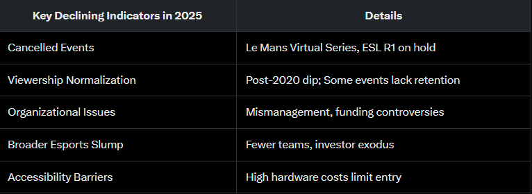 Weighing the evidence, sim racing esports in 2025 appears to be stabilizing rather than outright declining, with thriving elements in market expansion and flagship events offsetting setbacks. The pandemic's artificial boost has given way to sustainable growth, particularly in hardware and technology integration (e.g., AI coaching, VR). However, to truly thrive, the sector needs better management: Streamlined event formats, improved spectator experiences, and diversified funding beyond volatile sponsorships. Community sentiment on platforms like X suggests optimism, with users noting content's upward trajectory and predicting a "golden age."